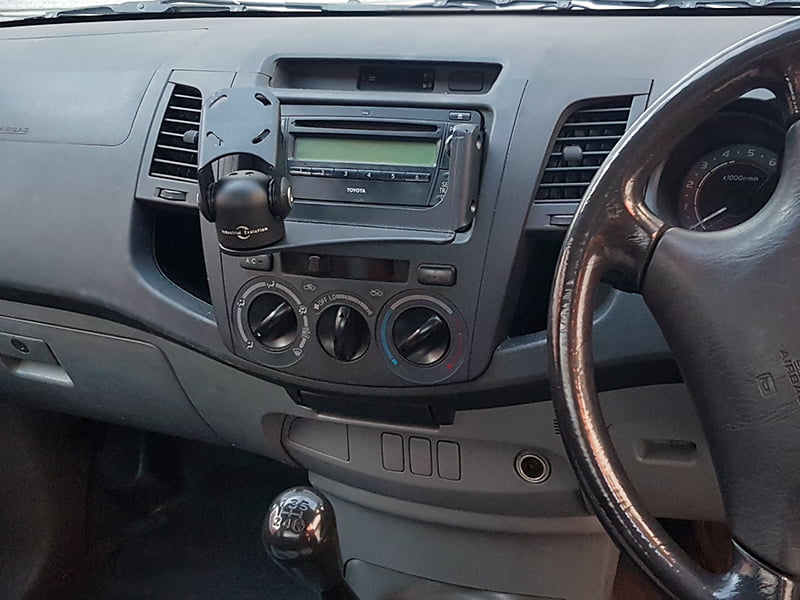 The Toyota Hilux dash mount (2005-13) is a heavy duty, versatile mounting bracket for compatible docks and digital devices. The secure design fits around the existing dashboard controls, and gives both driver and passenger easy access to all the car's creature comforts. Engineered to use existing secure mounting points behind your Hilux's dashboard. No need for drilling or cutting!